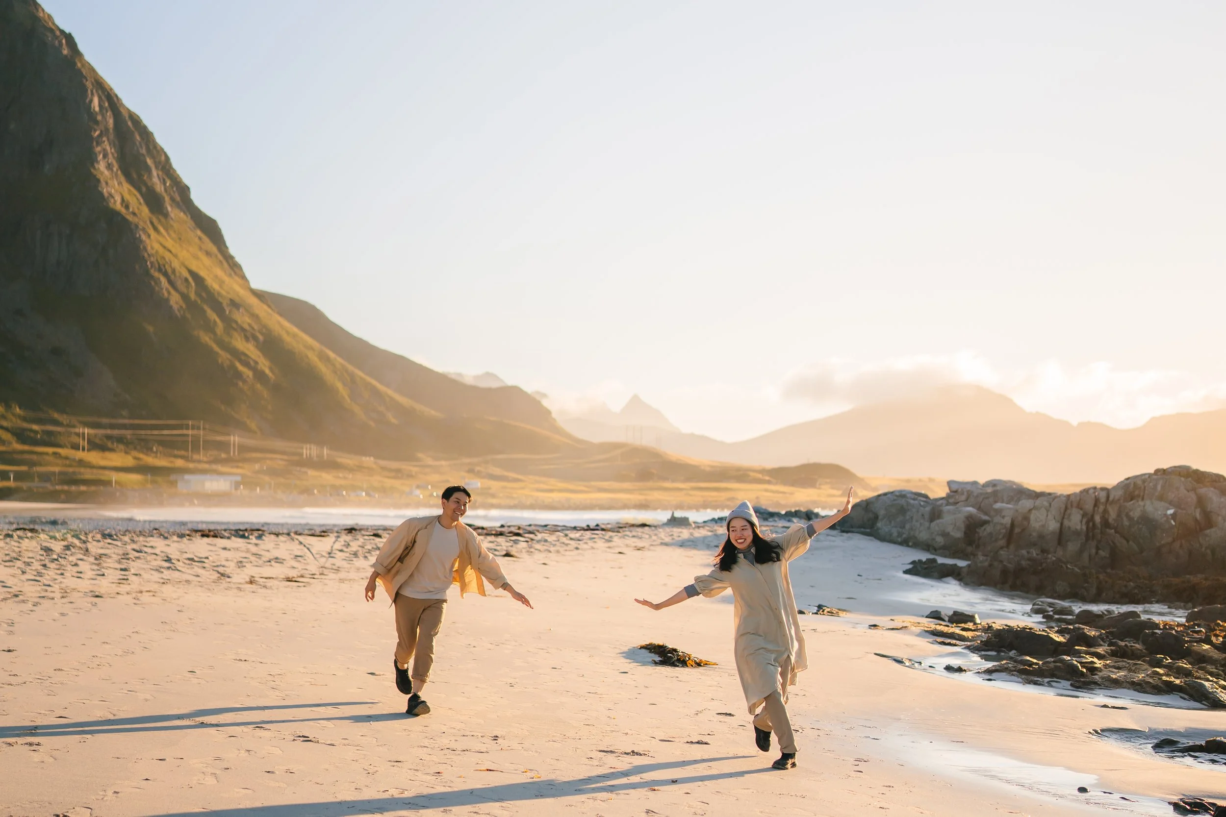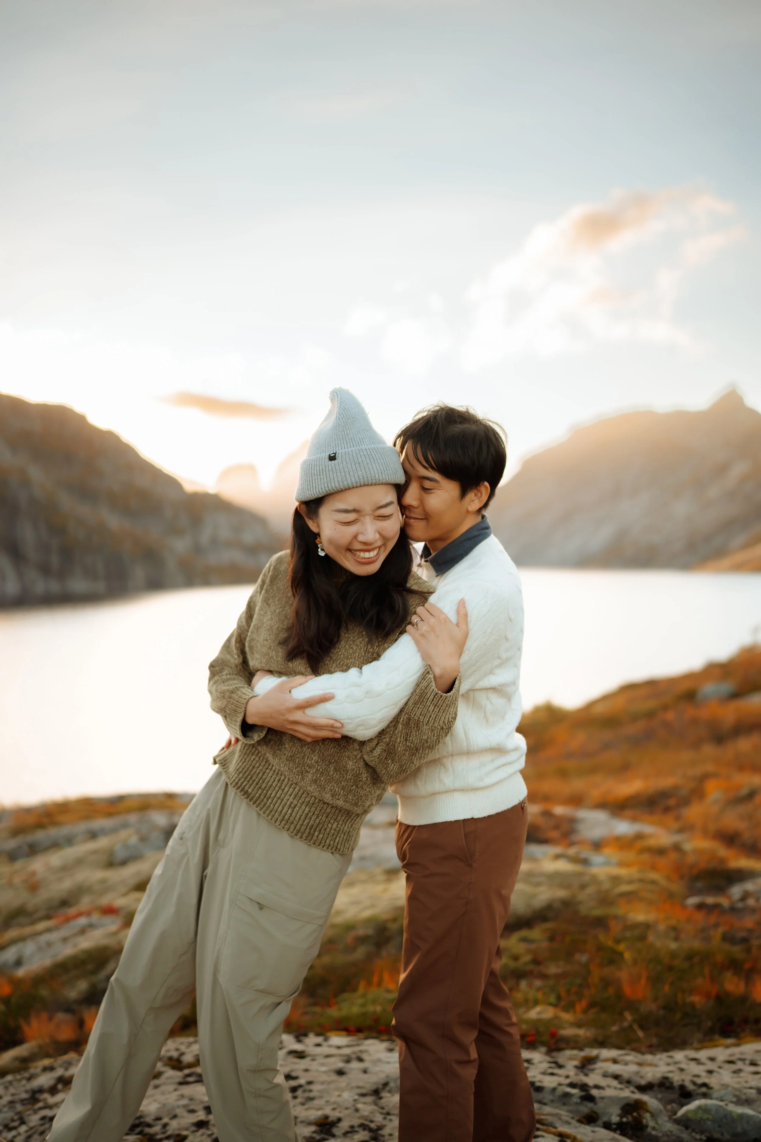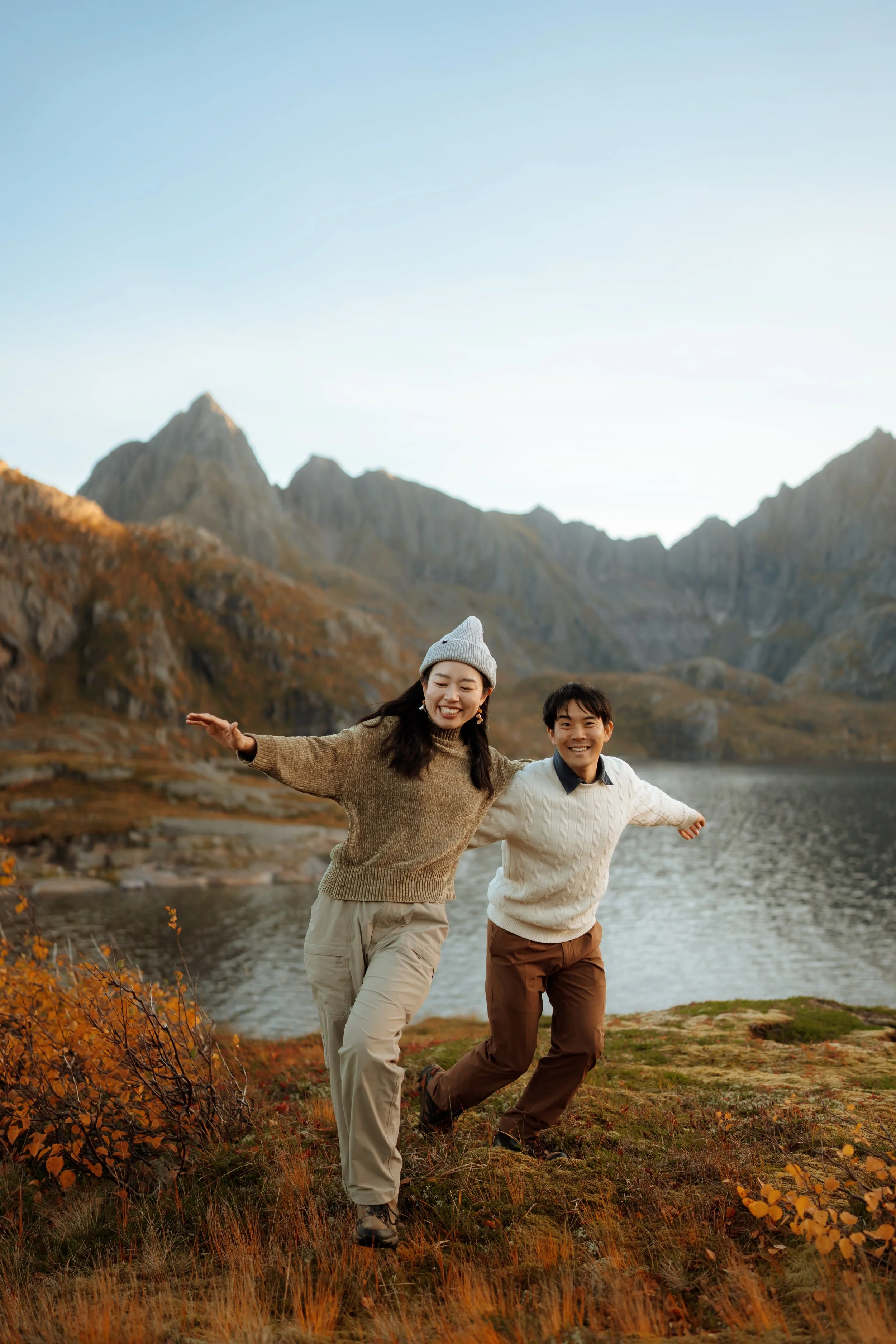 We recommend wearing comfortable outfits that make you feel confident and reflect your style. Neutral or earthy tones work beautifully in Lofoten’s landscapes. If it’s chilly, consider layers that you can easily add or remove during the shoot. We’ll also guide you on the best clothing choices when we plan your session!